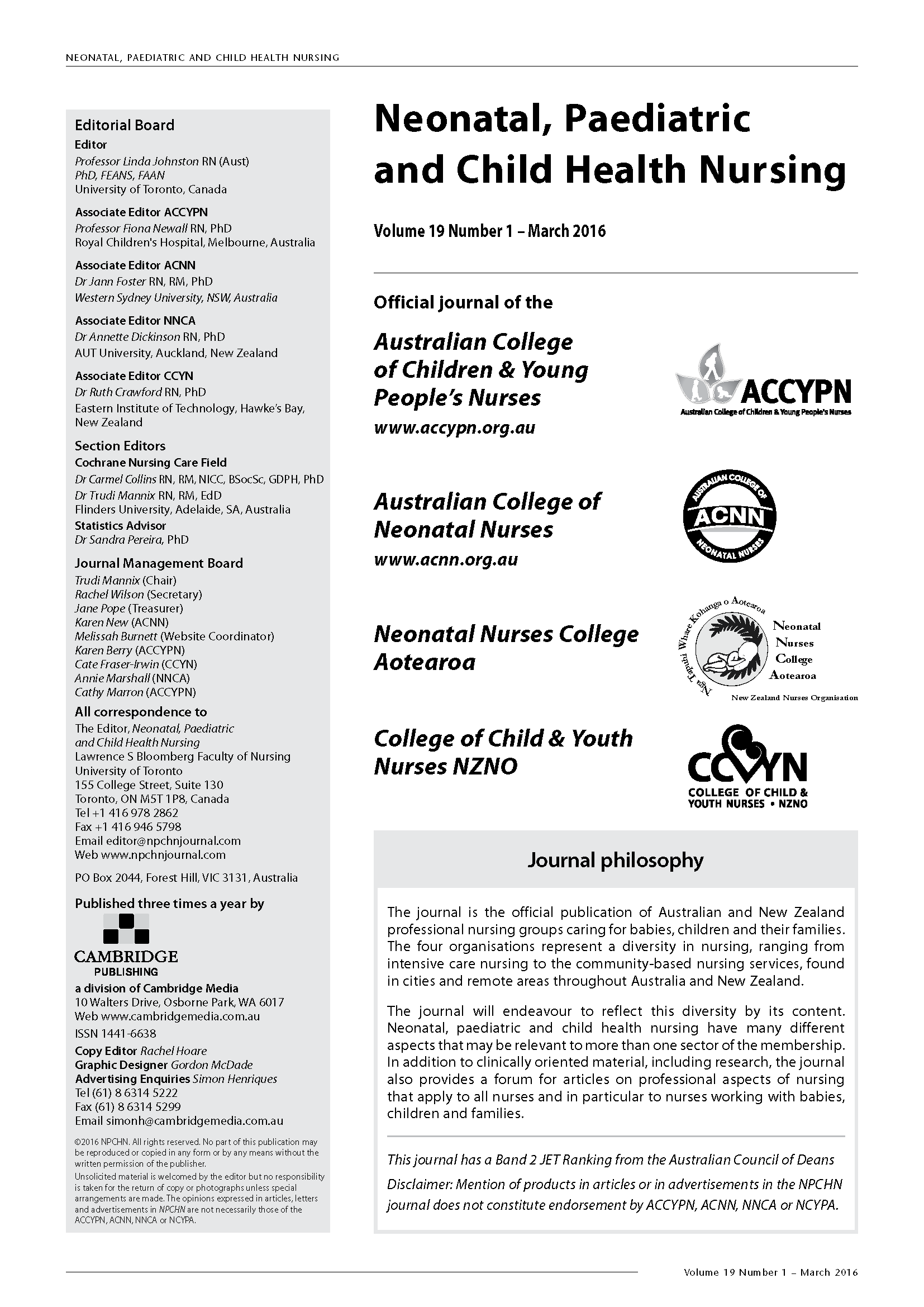 The NPCHN Journal was the official journal of the Australian College of Children and Young People's Nurses, Australian College of